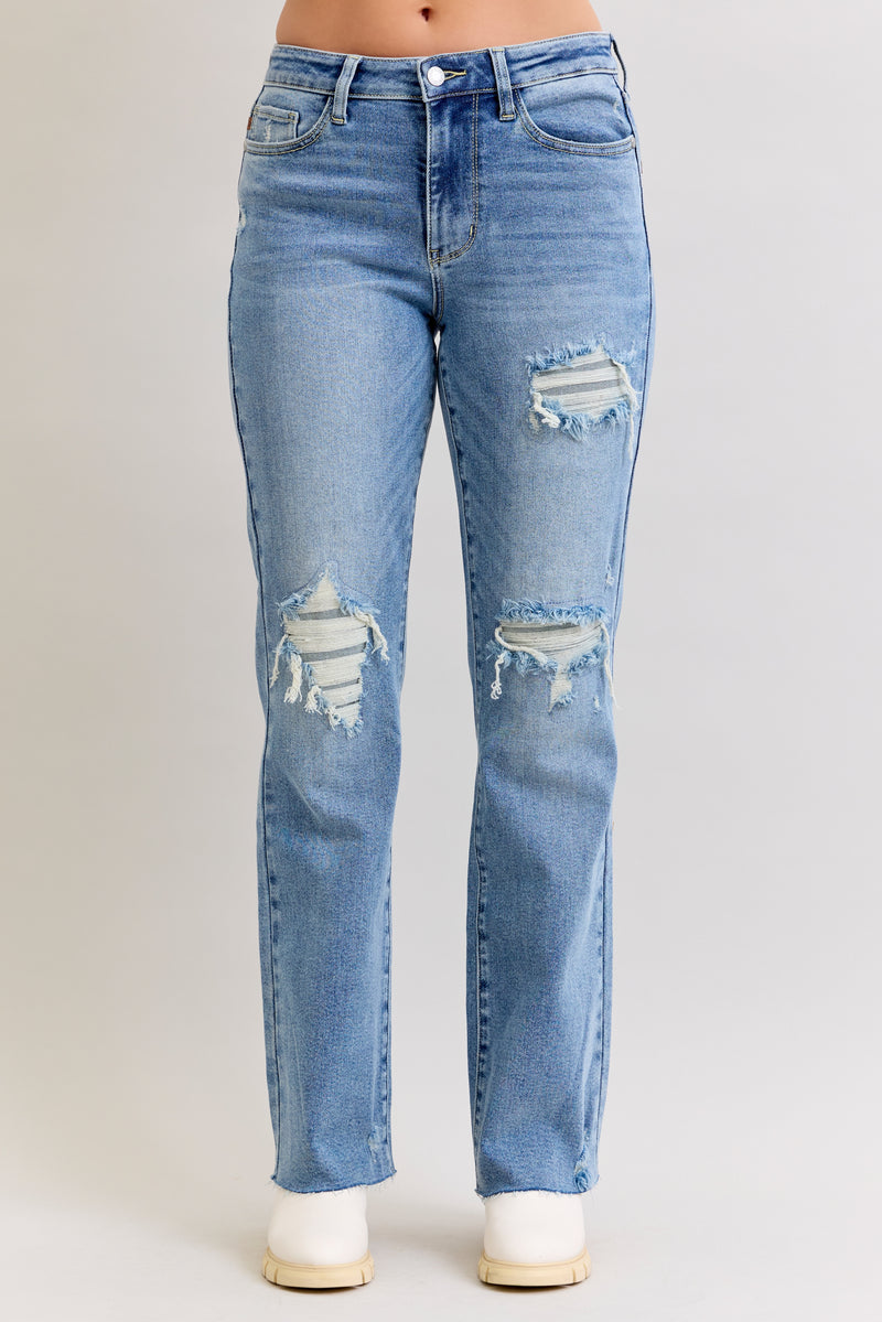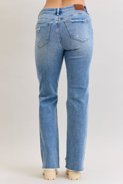 Step back into the '90s with Judy Blue's iconic straight-leg jeans. The mid-rise silhouette flatters your figure while distressed knees add authentic vintage character. Crafted from soft, stretchy denim, these jeans move with you for all-day comfort without sacrificing style. The light wash and timeless straight leg create an effortlessly cool aesthetic that pairs with everything in your closet. Whether you're channeling retro nostalgia or embracing timeless denim, these jeans deliver the perfect blend of comfort and undeniable style.