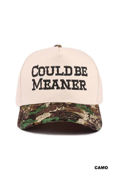 Rock an edgy attitude with this two-tone canvas hat featuring a bold "Could Be Meaner" statement. The classic camo design blends street style with attitude, making it the perfect accessory for anyone who wants to stand out. Durable canvas construction ensures lasting wear, while the structured fit keeps you looking sharp all day. Whether you're making a statement or just keeping it real, this hat delivers personality with every wear.