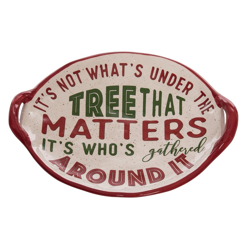 Celebrate the season with this charming ceramic oval platter, beautifully adorned with an "Around the Tree" design that brings festive warmth to any gathering. Measuring 11.25" × 8.75" × 2.25", this versatile piece is perfectly sized for serving holiday appetizers, cookies, or seasonal treats while doubling as an elegant tabletop accent. The decorative rim adds sophisticated detail that complements both traditional and contemporary holiday décor. Whether you're hosting a festive dinner party or looking to elevate your seasonal entertaining, this handcrafted platter combines functionality with timeless holiday charm that your guests will admire.