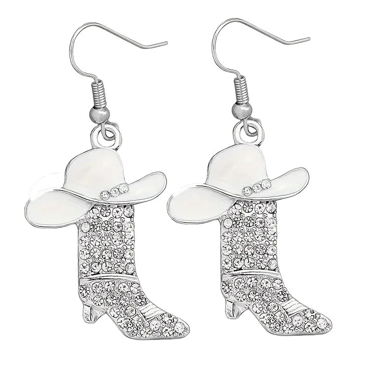 Rhinestone Cowgirl Boot & Hat Dangle Earrings - White