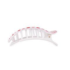 Lay flat and relax with the new TELETIES Candy Cane Crush Medium Flat Round Hair Clip in Red and White Stripes. This hair clip is designed to allow you to lay back flat, do yoga, or sit comfortably in a seat with a headrest, and it is made with the same material that is nearly unbreakable.