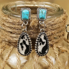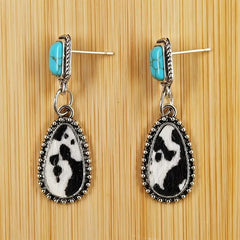 Vintage Cow Print Teardrop Earrings with Turquoise Accent