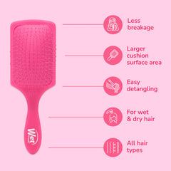 Its wider paddle shape covers more surface area, letting you brush larger sections efficiently for faster styling on wet or dry hair.